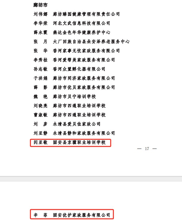 河北省妇联下发《关于确定2024年河北省五星级巾帼家政基地、五星级河北福嫂的通报》,经评审确定,固安县金月家政服务有限公司获评“2024年河北省五星级巾帼家政基地”;固安县京冀职业培训学校闫亚敬,固安优护家政服务有限公司辛菲获评“2024年河北省五星级河北福嫂”。